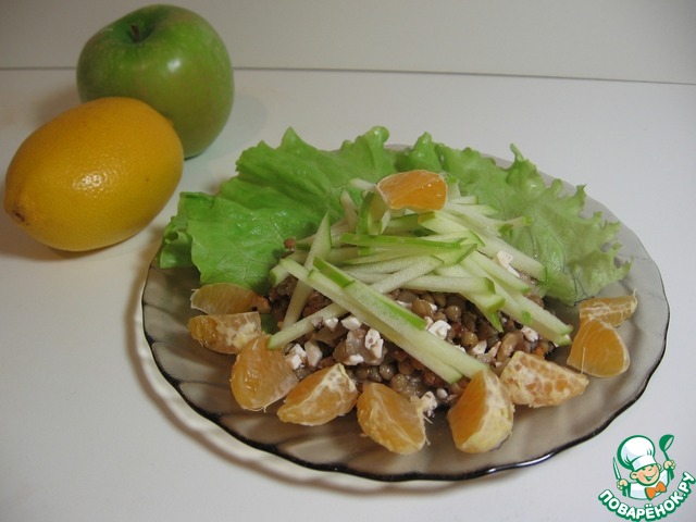 Нам понадобятся: зеленая чечевица (торогвой марки Мистраль), брынза (или фета), грецкие орехи, черешковый сельдерей и фрукты.