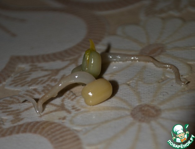 Начинаем проращивать маш. Промыли, залили водой на 8 часов (я ставила на ночь). По истечению этого срока маш следует промыть. Намачиваем полотенце либо кухонное вафельное, либо, к примеру, я брала маленькое махровое, оно лучше влагу держит. - простилаем полотенце на тарелку, высыпаем на него промытый маш и накрываем второй частью полотенца. Ставим в теплое место на 2 суток (можно меньше - будете смотреть по росткам). Единственное за чем надо следить - за влажностью полотенца, время от времени надо поливать его водичкой, чтоб сохранялась влажная среда.