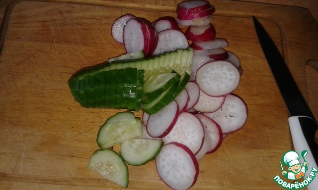 Редис и огурцы нарезать кружочками (или полукружочками, если крупные овощи)