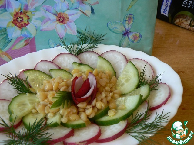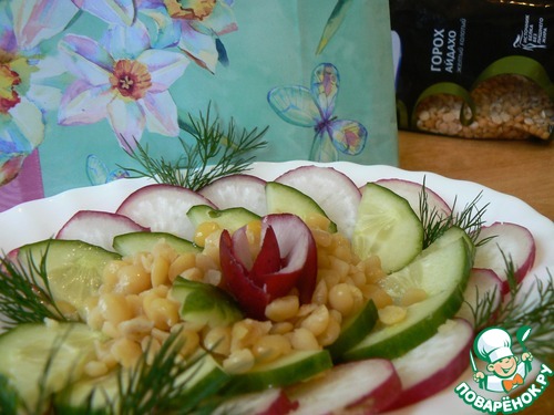 Блюдо прекрасно подойдет на закуску или станет легким ужином. Огурец и редиска приятно хрустят, наполняя нас витаминами, при этом содержат небольшое количество калорий, а горох, богатый белком подарит чувство сытости
