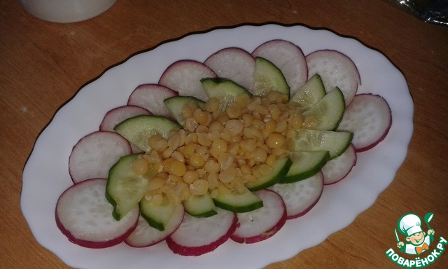 Далее можно поэкспериментировать, добавив в блюдо яйца, сыр, кусочки ветчины, но я решила сделать его максимально легким и простым. По кругу уложить редиску, затем огурцы, а в центр отварной горох. Посолить по вкусу