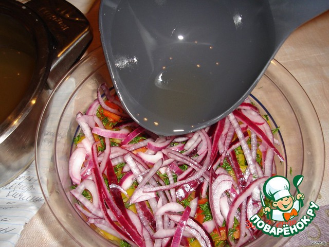 Бульон, процеженный из под овощей, смешать с желатином, процедить и остудить.