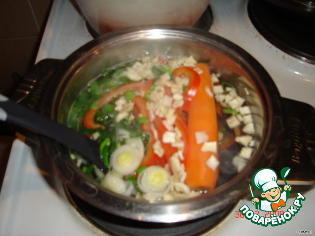 Отвариваем 2 моркови целиком+сельдерей (корень, у меня сушёный)+лук-порей (немного)+болг. перец (немного)+соль+перец.