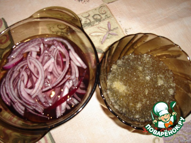 Синий лук нарезать полукольцами и замариновать в столовом уксусе,
