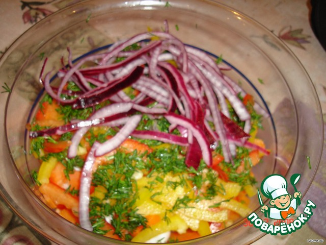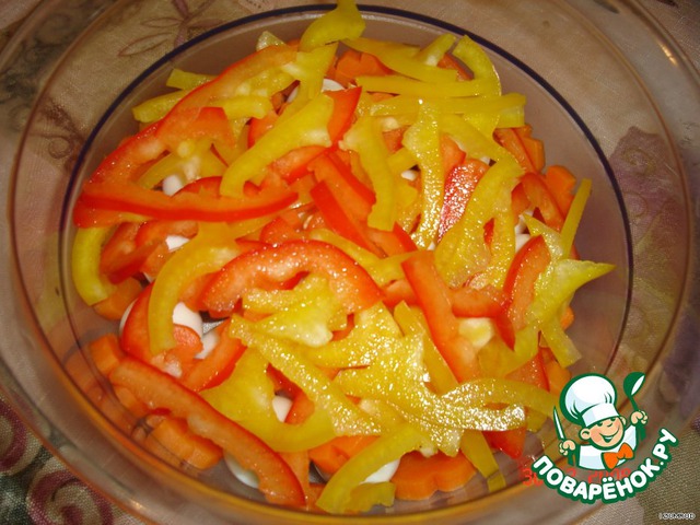 На морковь выкладываем тонко нарезанный болгарский перец.