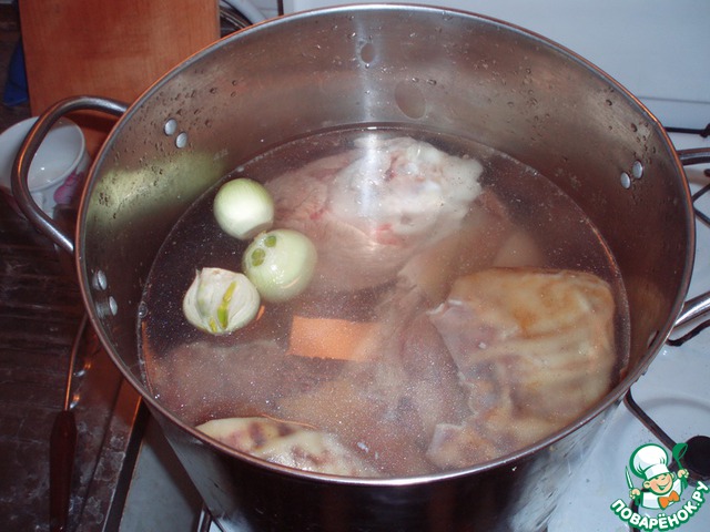 Для этого нам надо пойти на рынок и уболтать мясника, чтобы он от головы свиной Вам продал рыло и уши. Так же можно прикупить язык, сердце и обрезки мяса (гуляш) - это все сгодится.