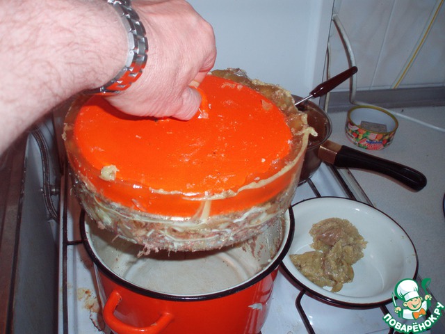 Затем так же собираете желированный бульон. И в отдельную кастрюльку, прокипятите и разлейте по порциям. Можете есть как желе, а можете разогреть и пить как бульон.