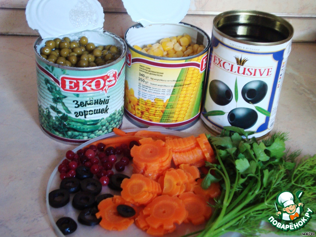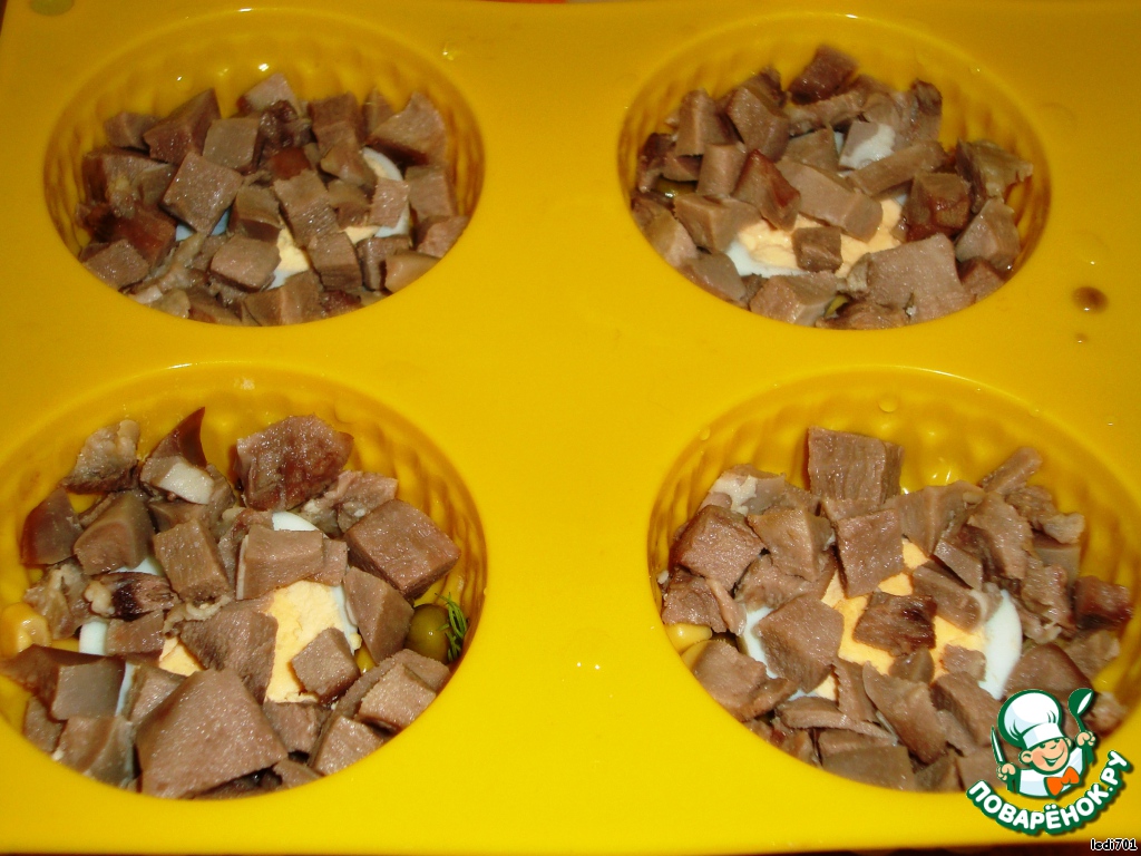 Затем засыпаем резаным языком, зеленым горошком и кукурузой.