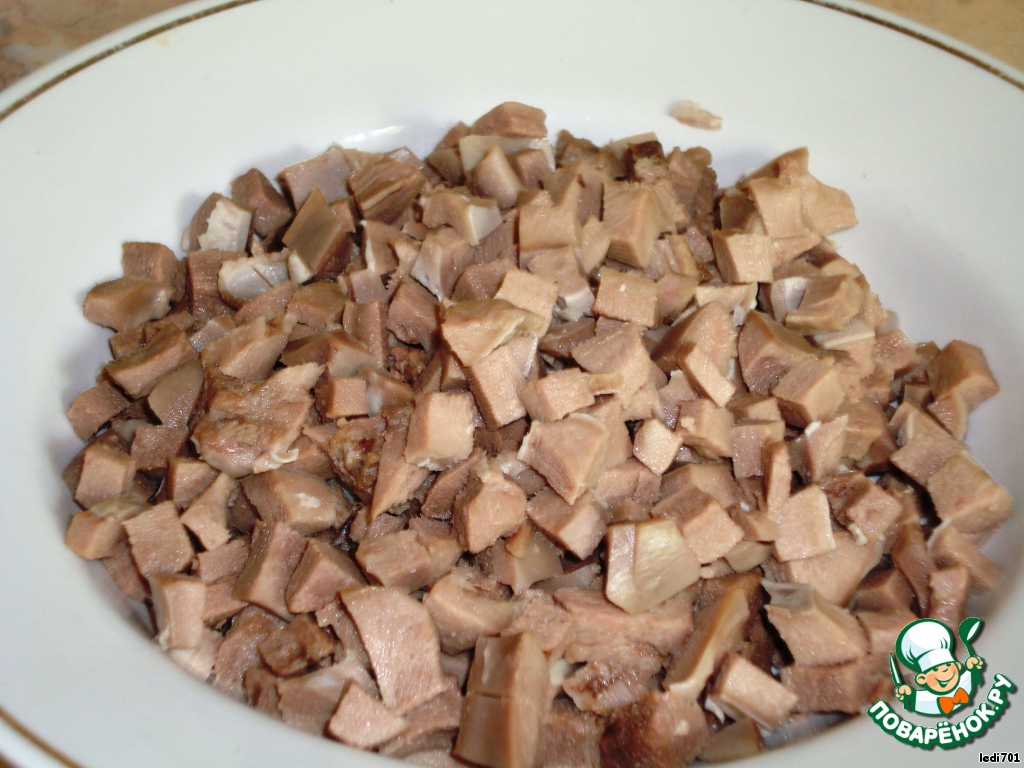 Затем кладем резаный язык, зеленый горошек и кукурузу.