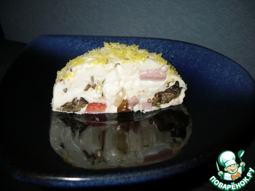 | Несложное, в приготовлении, очень нежное по своей структуре, тающее во рту заливное с жареными грибами с луком, ветчиной, кукурузой, яйцами и зеленью замечательно подойдёт как для праздничного стола, так и для повседневного. Особая благодарность Ларисе Dopleta. |