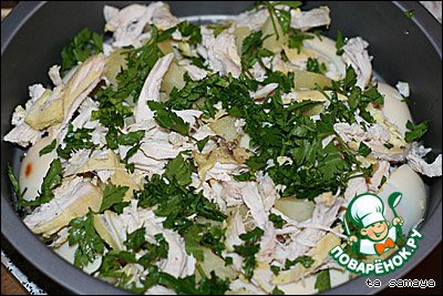 Отвариваем курицу, мелко ее нарезаем или даже расщепляем руками. Режем петрушку. Все красиво раскладываем.