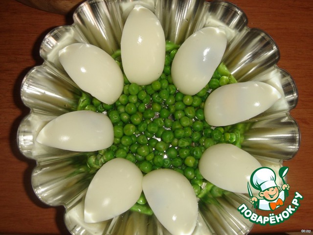 На дно формы (как для для кекса) выложить слой горошка, по стенкам яичные четвертинки. Залить бульоном и дать немного "схватиться".