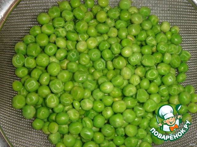 Зеленый горошек бланшировать в 400 мл. горячей воды 3-5 минут.