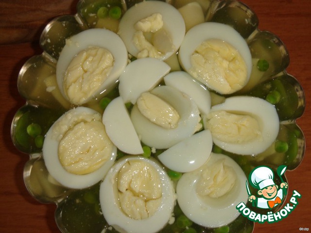Выложить оставшийся горошек, покрыть яичными кружочками и вылить оставшийся бульон с желатином. Поставить в холодильник застывать.