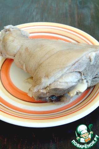 Бульон посолить. Оставить рульку остывать в бульоне, она будет более сочной. С отваренной рульки аккуратно снять кожу целиком и так же аккуратно срезать лишний жир, стараясь не порезать кожу.