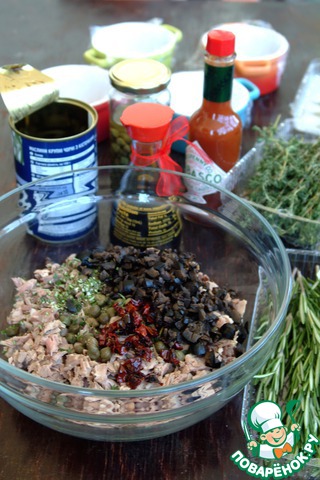 Добавить в него мелко нарезанный розмарин, листики тимьяна, каперсы. Порезать мелко маслины, вяленые томаты, добавить к мясу. Посолить, поперчить, добавить соевый соус "Киккоман", табаско по вкусу. Хорошо все перемешать.