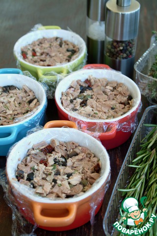 Мини-террины из свиной рульки с маслинами, каперсами и вялеными томатами