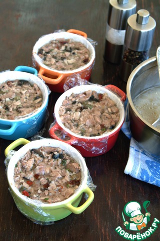 Формочки выстелить пищевой пленкой (она поможет быстро и легко освободить террин из формы).