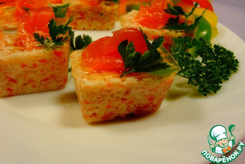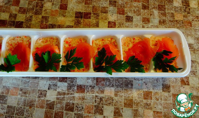 Сверху воткнуть кусочек лосося, красиво завёрнутый лепестком. Воткнуть веточку петрушки и залить до самого верха бульоном с желатином.