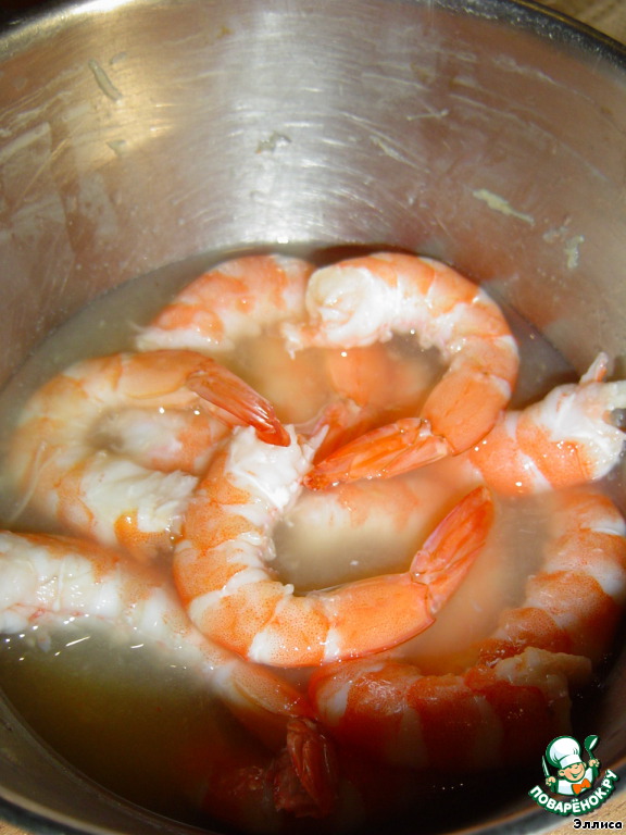 Отварные креветки очищаем, складываем в миску и заливаем лимонным соком. Оставляем их мариноваться на полчаса.