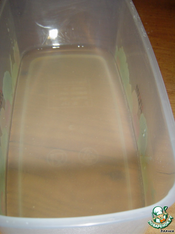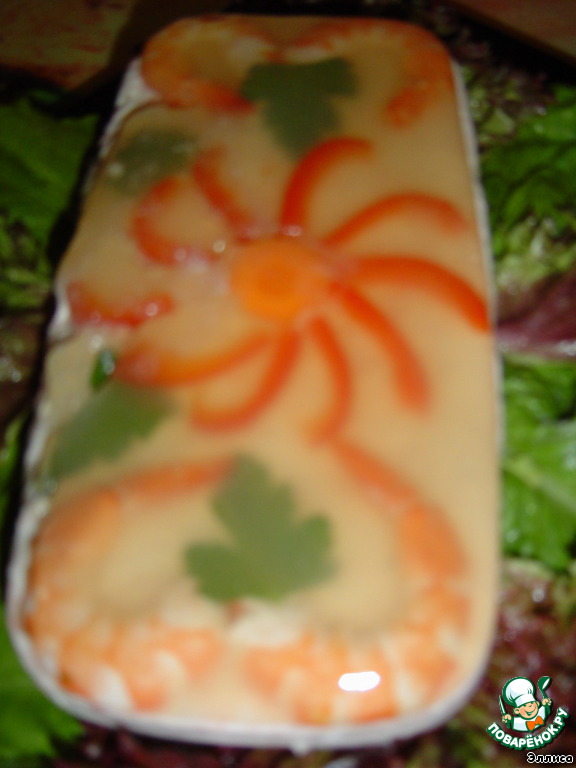 Я бы посоветовала выстелить форму пищевой пленкой, чтобы потом заливное хорошо отделялось от формы. А то у меня вышла оказия, кусочек прилип..., и испортил весь внешний вид.