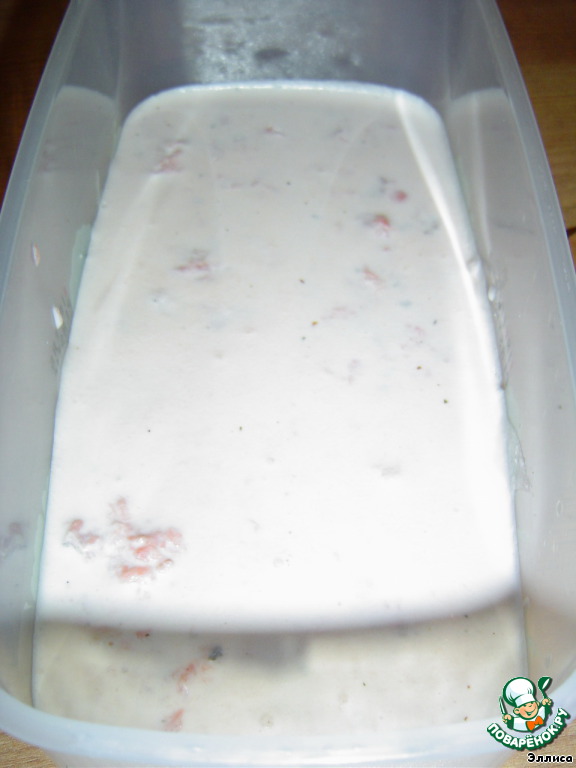 К рыбно-творожной массе добавляем половину оставшегося желатинового раствора, перемешиваем и выкладываем сверху, на застывший слой с креветками. Также даем застыть в холодильнике.