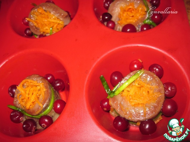 | Порционная холодная закуска из филе сельди, клюквы и моркови по-корейски. |