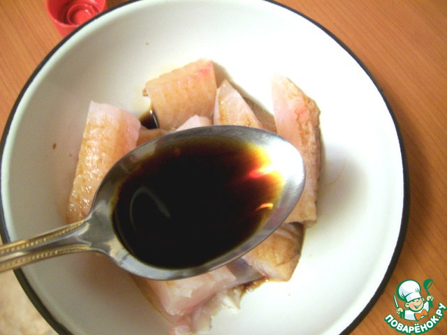 Срежем с хребта щуки филе, зальем его соевым соусом "Киккоман", дадим постоять минут 15.