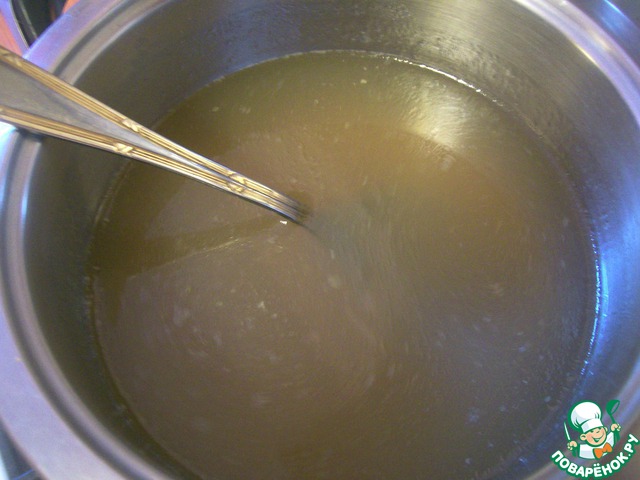 В небольшой части остывшего бульона замочим желатин, подождем, пока он набухнет, нагреем его (не кипятим) до растворения. Все время помешиваем, чтоб не пригорел. Выльем в готовый бульон.
