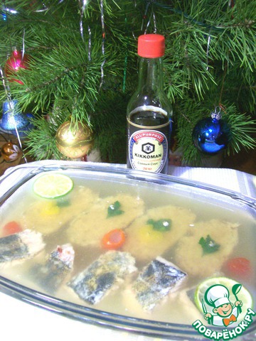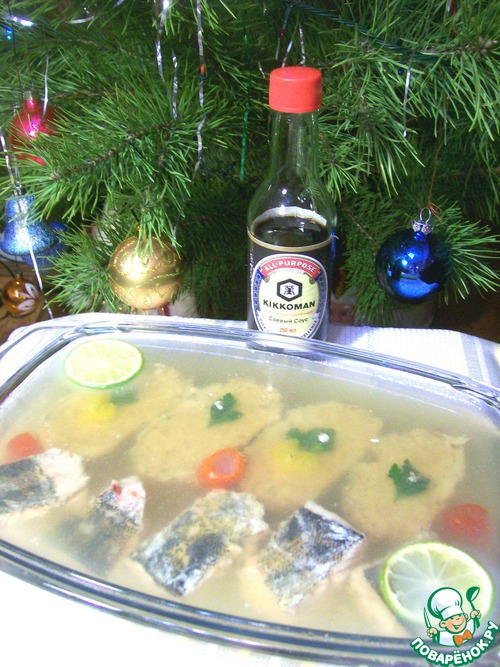 Начинаем собирать заливное. Выкладываем в блюдо кусочки судака и фаршированной щуки, немного заливаем бульоном и ставим в холодное место до застывания.