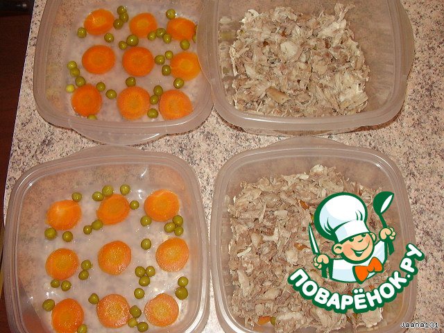 Сваренные кости вытащить из бульона и поставить остывать. Разбирать руками а то косточки могут попасть. Бульон процедить через несколько слоев марли и туда добавить порубленный чеснок. Желатин развести в отдельной посуде в теплом бульоне. После полного растворения вылить в основной бульон. В формы на дно порезать морковку и можно добавить горошек. Положить сверху слой мяса и залить бульоном. Поставить остужаться и когда остынет можно в холодильник. Только крышкой нельзя закрывать до полного застывания. Результат показать не могу, все умяли и сфоткать не успела.