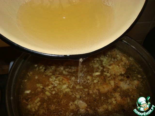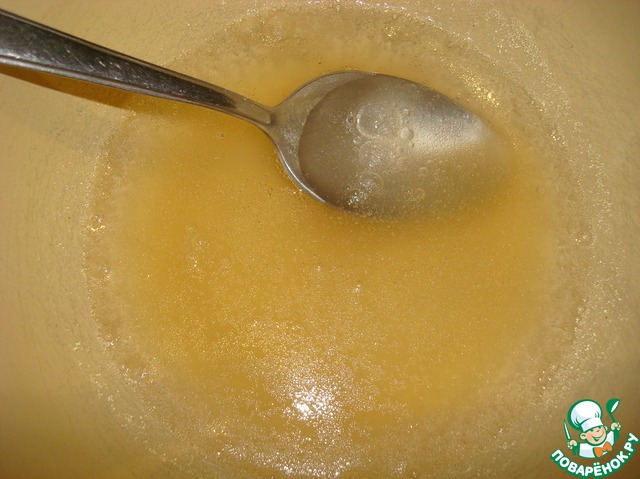 Набухший желатин нагреваем до кипения, но не кипятим и выливаем в бульон. Перемешиваем