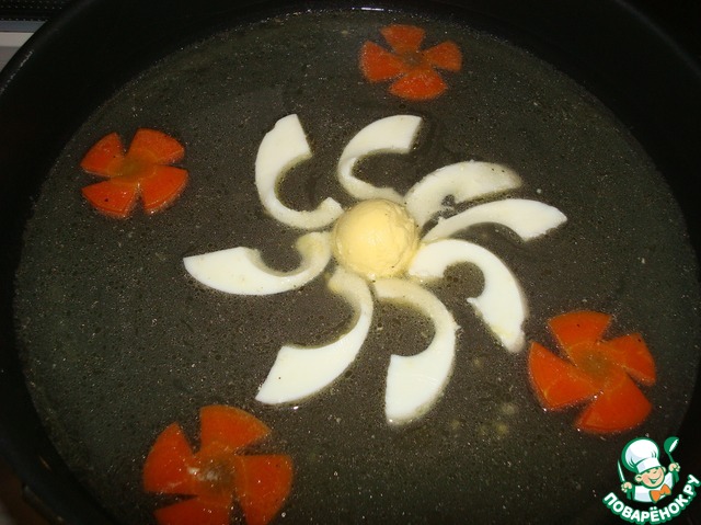 Ну а теперь самое интересное - формируем заливное: отцеживаем бульон в форму (у меня диаметр 24 см) на высоту 1 см и ставим в холодное место для застывания