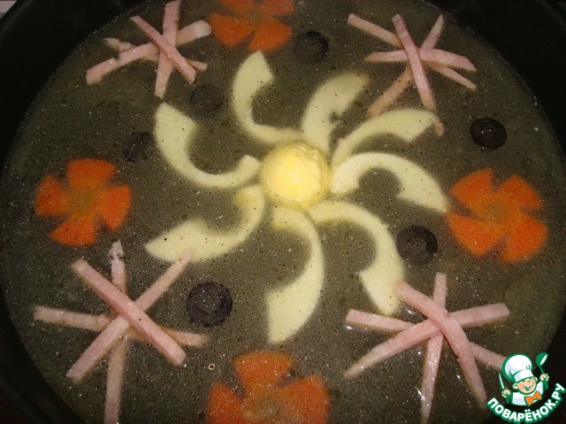 Теперь режем колбаску соломкой и выкладываем цветочки, оливки нарезаем кружочками. Всё снова заливаем процеженным бульоном.