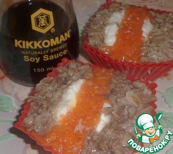 Затем снова яйцо и слой из мяса. Теплый бульон смешиваем с соевым соусом и быстрорастворимым желатином. Соль добавляем по вкусу. Заливаем формочки бульоном. Ставим формочки в холодильник для застывания.