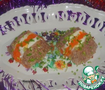 | Слоеное вертикальное заливное из мяса свинины. Очень сытное, вкусное и в тоже время яркое блюдо. |