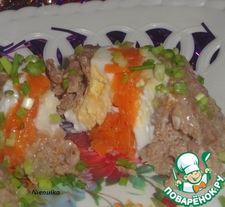 Яйцо отварное разрезаем вдоль на 4 части. Ставим кусочек яйца к мясу.