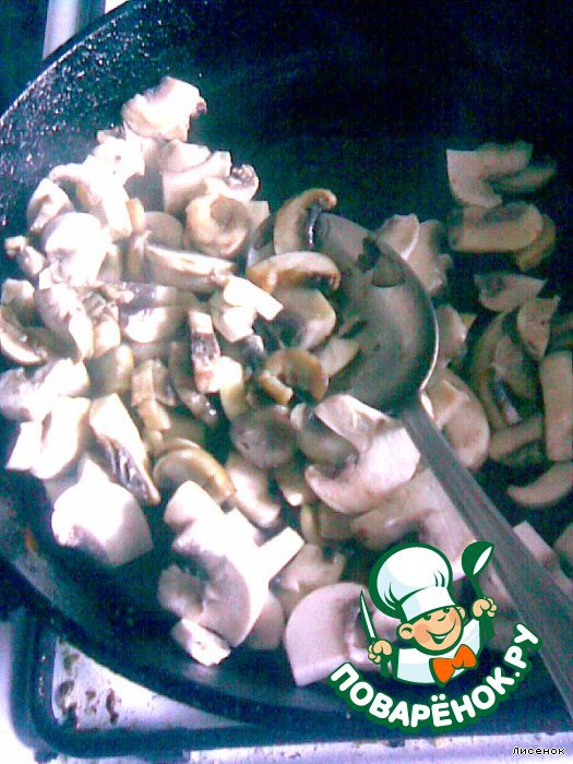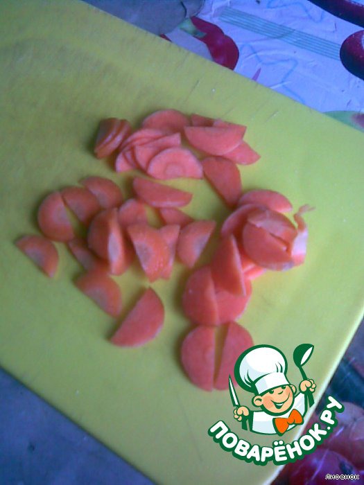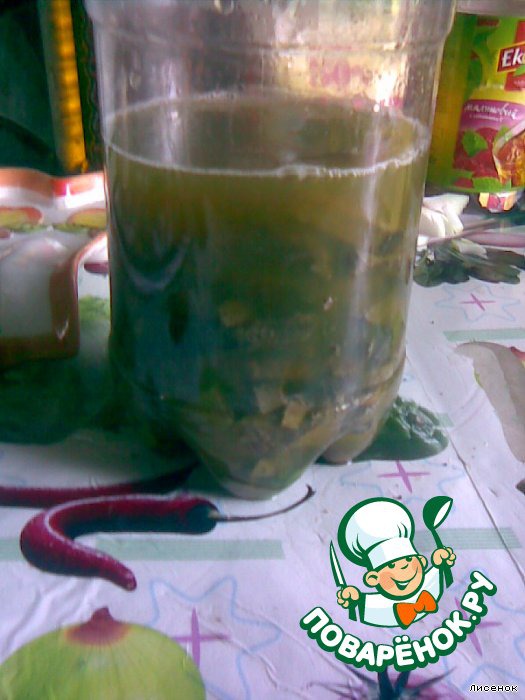 в обычную пластиковую бутылку(м ожно пакет от сока) положить зелень, сваренную вместе с печенью, морковь, грибы, нарезанную печень. Залить бульоном(с растворенным до конца желатином. Я брала 2-х литровую бутылку, поэтому заранее обрезала верх. Ставим застывать в холодильник.