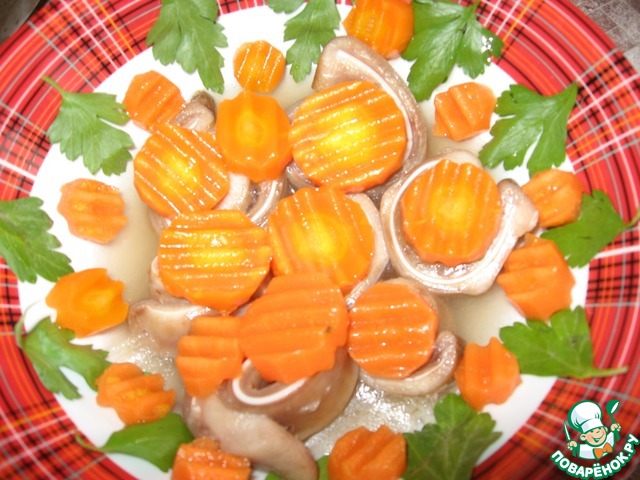 Морковку нарезаем кружочками, петрушку рвем на листики и укладываем поверх ушей, заливаем желе и в холодильник до застывания
