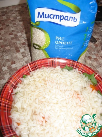 Отвариваем рис "Мистраль", охлаждаем его, перемешиваем с оставшимся желейным бульоном, укладываем последним слоем.