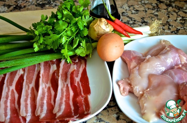 1. Разогреть плиту до 180С. Курицу и бекон порезать на кусочки средней величины, лук и чили порубить. Сложить куриное мясо, бекон, чеснок, зеленый лук, кинзу, чили, рыбный соус, яйцо и имбирь в блендер и прокрутить до консистенции фарша.