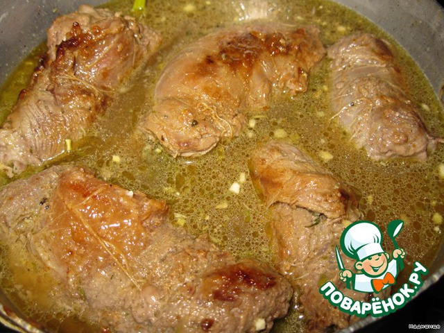 наливаем в кастрюльку немножко воды, добавляем специи, бульон. Кладем рулетики в кастрюльку и тушим на малом огне до готовности. Вкусненько! Смачного!