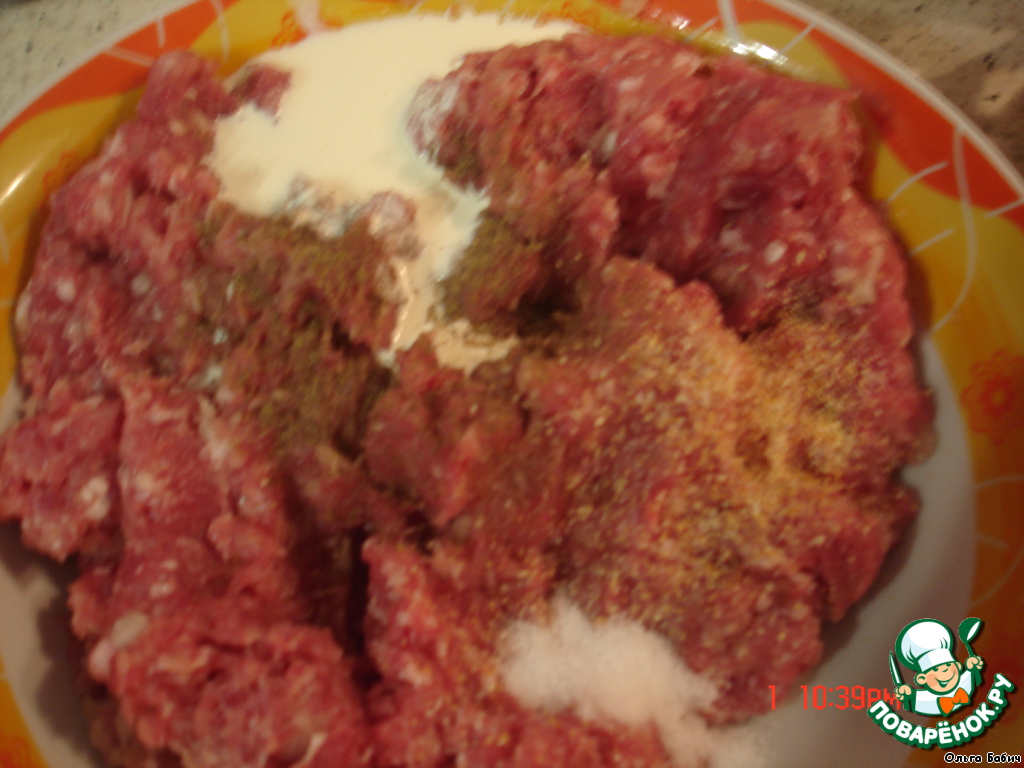 приготовить фарш (какой любите), перемолоть лук в блендере, добавить специи, сливки, 1 яйцо (я добавила позже, поэтому на фото его нет). Хорошо перемешать!