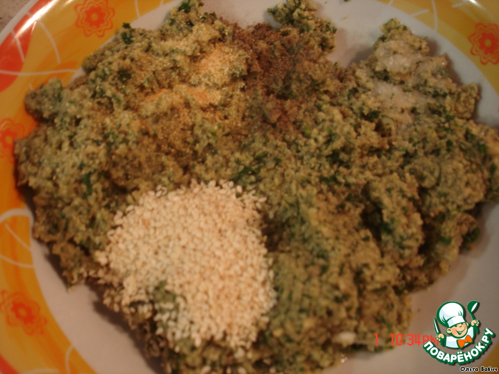 Добавить специи для грибов, кунжут. Хорошо перемешать.