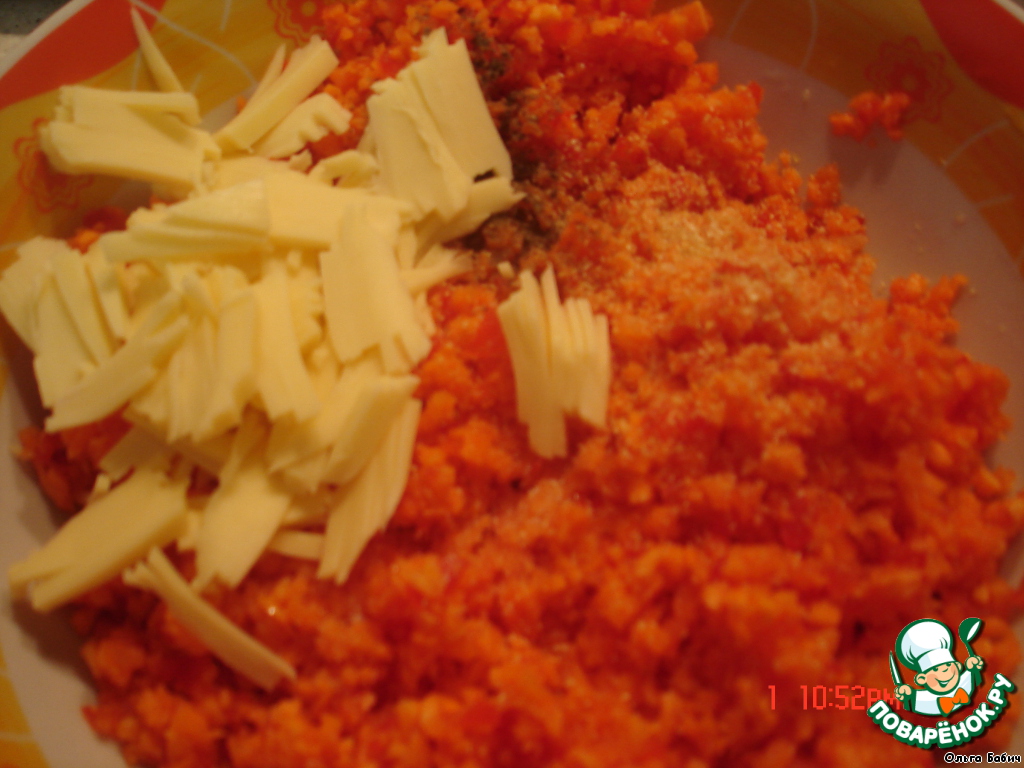 Перемолоть в блендере морковь с перцем, добавить мелко нарезанный сыр (немного оставить для присыпки)