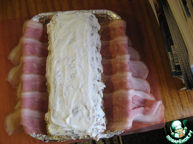 Выстилаем форму полосочками бекона так, чтобы свисали края. Для моей формы я использую 12 полосочек.
