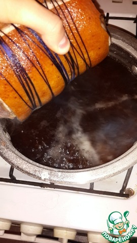 Воду вскипятить, добавить в нее соль и отвар луковой шелухи и после закипания положить в него рулет, довести до кипения и убавив огонь варить 40 минут