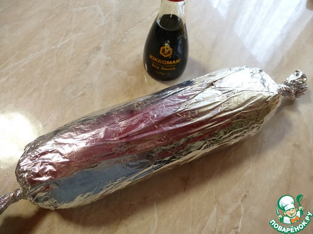 Сворачиваем как можно плотнее курочку, обязательно поверхность рулета подсолить и полить соевым соусом (соус придаст корочке золотистость).