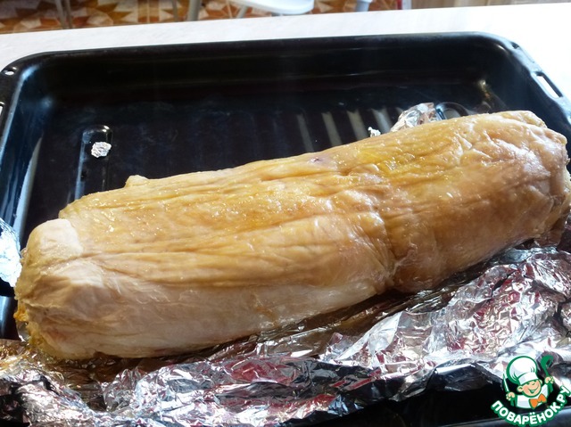 По окончанию 40 минут, с рулета разрываем фольгу и убираем рулет в духовку еще запекаться на 30 минут при 180 градусах.