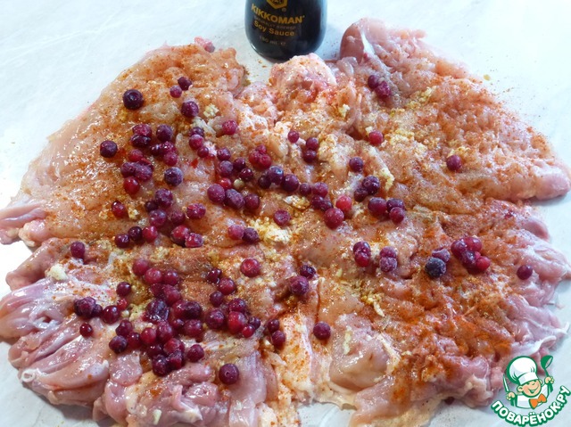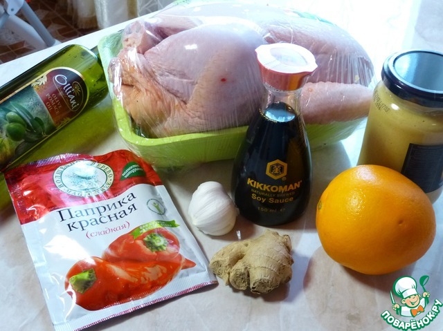 Основные продукты которые нам понадобятся: курица, соевый соус, имбирь, паприка, чеснок, перец черный, соль, горчица дежонская, апельсин, масло оливковое и брусника замороженная.